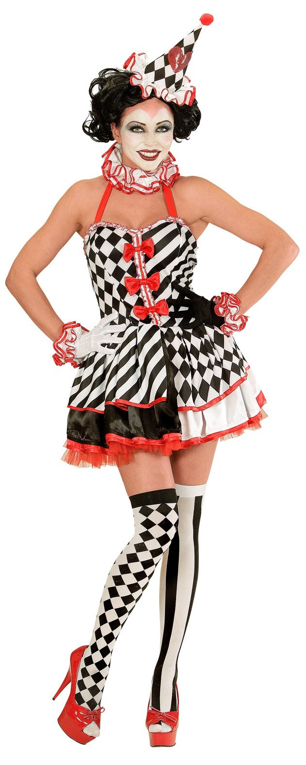 Incluye: vestido de punto estampado y ribeteado, decorado con pajaritas de raso rojo en el pecho, y con lazo grande de raso rojo en la parte trasera. Collar y puños haciendo juego y sombrero. Este es un disfraz súper novedoso, que también se esta utilizando para Halloween con maquillajes de terror realizados con las sangres de las que disponemos. También disponible el antifaz (Ref. 00856) haciendo juego.