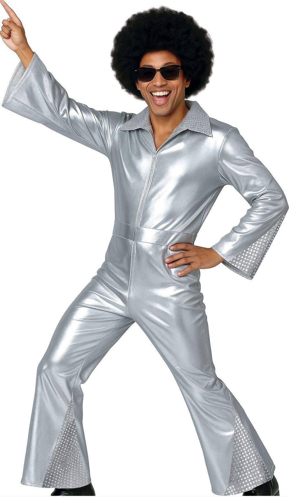 ¿Estás buscando un disfraz disco para tu fiesta? Con el disfraz disco plateado con brillos para adulto tendrás el mono perfecto para acudir a tu fiesta como un verdadero chico disco de los años 70, y destacarás en tu fiesta de disfraces por tu gran originalidad.