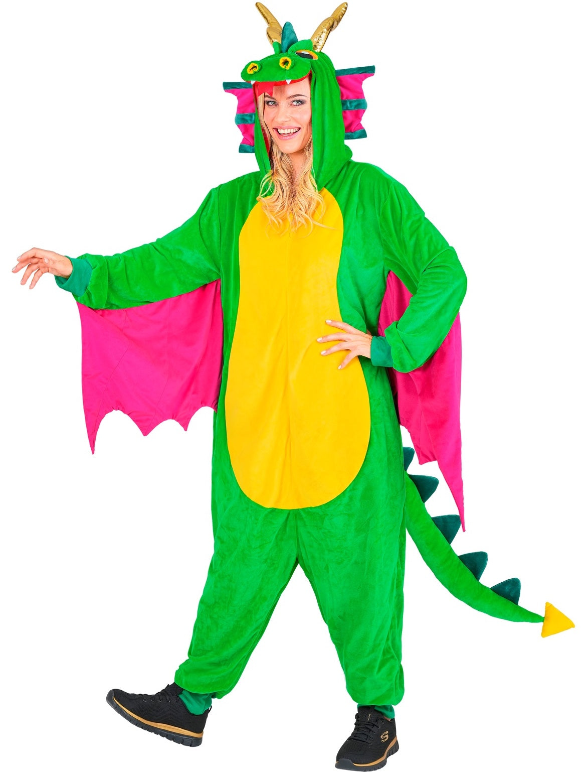 ¿Quieres convertirte en el personaje más temido de los cuentos de la forma más cómoda? Con este disfraz estilo pijama de dragón en color verde y rosa para hombre y mujer, serás el foco de atención de tu fiesta de disfraces. ¡El espectáculo está asegurado!