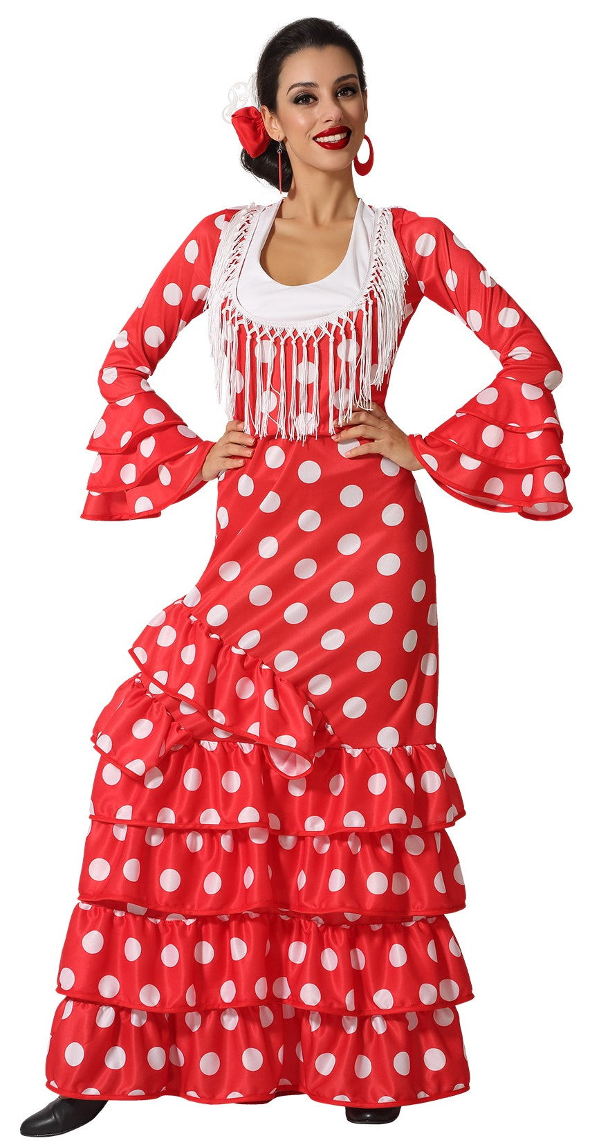 ¿Buscas el traje más elegante para tu fiesta temática? Este disfraz de flamenca en color rojo para mujer te convertirá en una auténtica sevillana recién salida de la feria de abril.