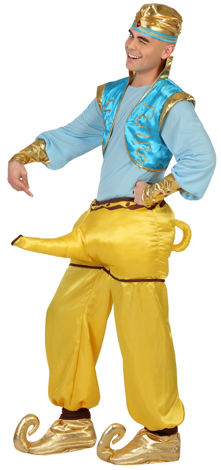 Incluye: Pantalón en raso amarillo con lámpara mágica, camisa en punto con puños en lame oro, chaleco en raso y lame decorado con pasamanería oro y gorro en lame oro. Este es un disfraz súper original y con el no dejarás indiferente a nadie. Especial para despedidas de soltero. En nuestra sección de complementos podrás encontrar los cubrezapatos en lame oro.